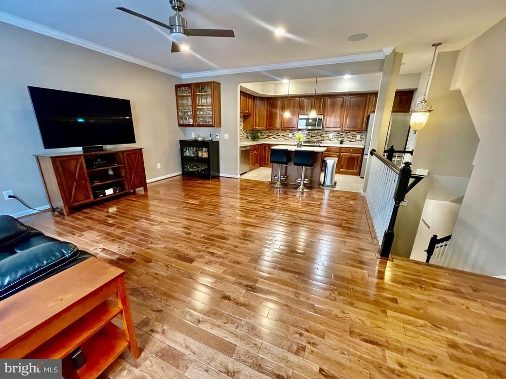 Spacious and beautifully maintained 3-level townhome offering over 1,930+ sq ft with 3 bedrooms, 2.5 baths, and a rear-loading attached garage in the sought-after Condominiums at Kirkpatrick Farms. Nestled on a quiet street, this home features a tailored brick façade, covered entrance, large balcony, open floor plan, rich engineered hardwood planks flooring, neutral designer paint, decorative moldings, contemporary lighting, recessed lighting in the living room, kitchen, and primary bedroom, and abundant natural light throughout. The welcoming foyer leads to a bright and airy main level featuring a spacious 9ft ceiling living room with crown molding and twin windows, and a dining area ideal for both everyday living and entertaining. The gourmet kitchen boasts 42” maple cabinetry, granite countertops, stainless steel appliances, and a tiered center island seating that opens to a cozy family room. A convenient powder room completes the main level. Upstairs, the luxurious primary suite offers a tray ceiling, ceiling fan, hardwood flooring, 2 separate walk-in closets, and a spa-inspired en-suite bath with a granite-topped vanity and oversized walk-in shower with dual shower heads. Two additional generously sized bedrooms share a well-appointed hall bath, and the upper-level laundry adds everyday convenience. Enjoy all the amenities Kirkpatrick Farms has to offer, including a community pool, basketball and tennis courts, walking/jogging trails, playgrounds, and more. Ideally located near Braddock Road and Routes 50, 15, and 28, with easy access to shopping, dining, entertainment, parks, and golf courses. A perfect combination of comfort, style, and location. Tons of free parking. RECENT UPDATES: Furnace and AC (2025), water heater (2022), 2nd bathroom totally remodeled 2025, Roof (2023, asphalt shingles), Kitchen floor tiles (2024), This home truly has it all!